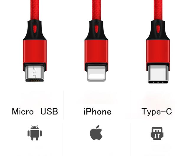 1本3プラグ、自由切替、Apple&Android&Type-Cの3種充電プラグ付き、各種のデバイスの充電要求に応えて、プラグ自由に切替できます!
