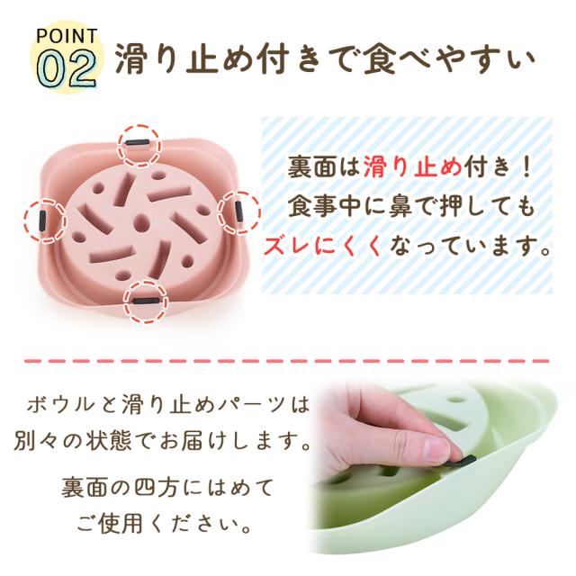 底面には滑り止め(すべり止め)加工を施しており、食事中にボウルがズレにくくなっています。元気なわんちゃんが勢いよくご飯を食べても安心。ストレスの少ない食事環境を整えたい方におすすめの犬用食器です。