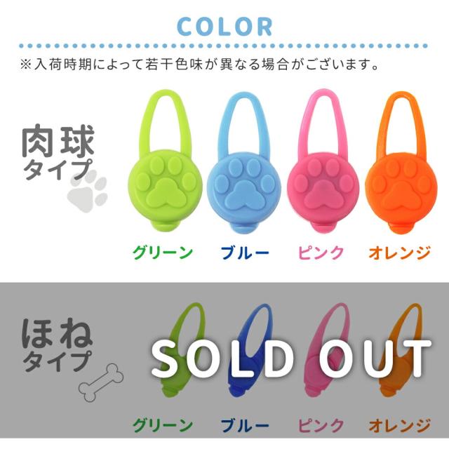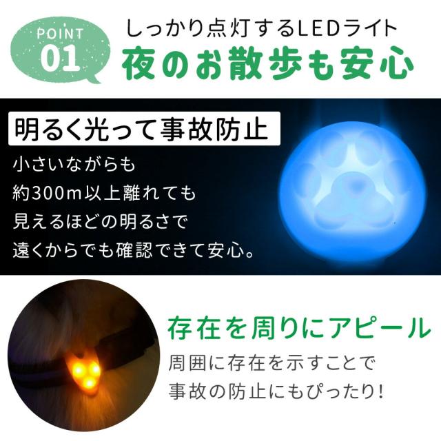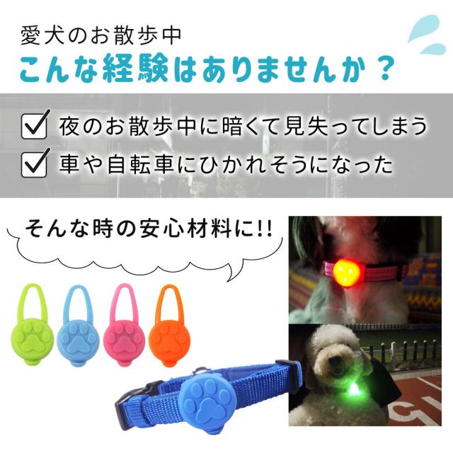 LED/散歩/散歩ライト/お散歩ライト/お散歩/シリコン/LEDライト/犬/猫/犬用/猫用/ランニング/安心/点灯/点滅/バッグ/首輪/防止/事故/事故防止/セーフティ/セーフティーライト/補助/明るい/軽量/軽い/夜/夕方/朝方/犬の散歩/リード/ランキング/ウォーキング/グリーン/ブルー/ピンク/オレンジ/肉球/ほね/ハーネス/大型犬/中型犬/小型犬/
