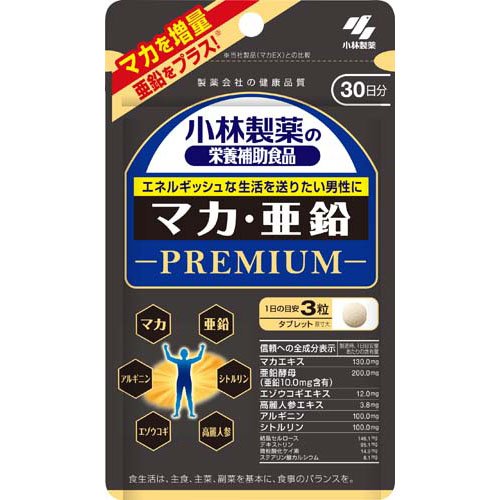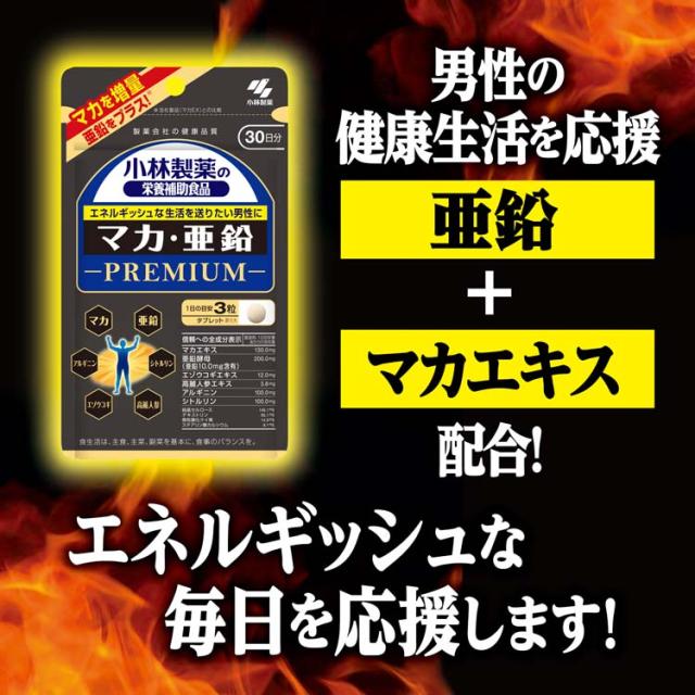 ●小林製薬の「マカ・亜鉛-PREMIUM-」は、いつまでも現役でいたい!イキイキとした生活を送りたい!といった実年男性のために開発されたサプリメントです。
