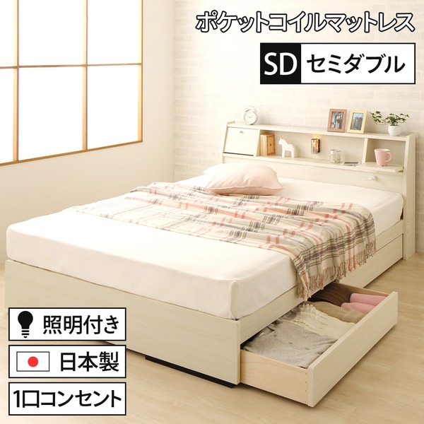 フラップテーブル付 照明付 収納ベッド セミダブル (ポケットコイルマットレス付き)『アジット』 ホワイト木目調 宮付き 白 【北海道・沖縄・離島配送不可】