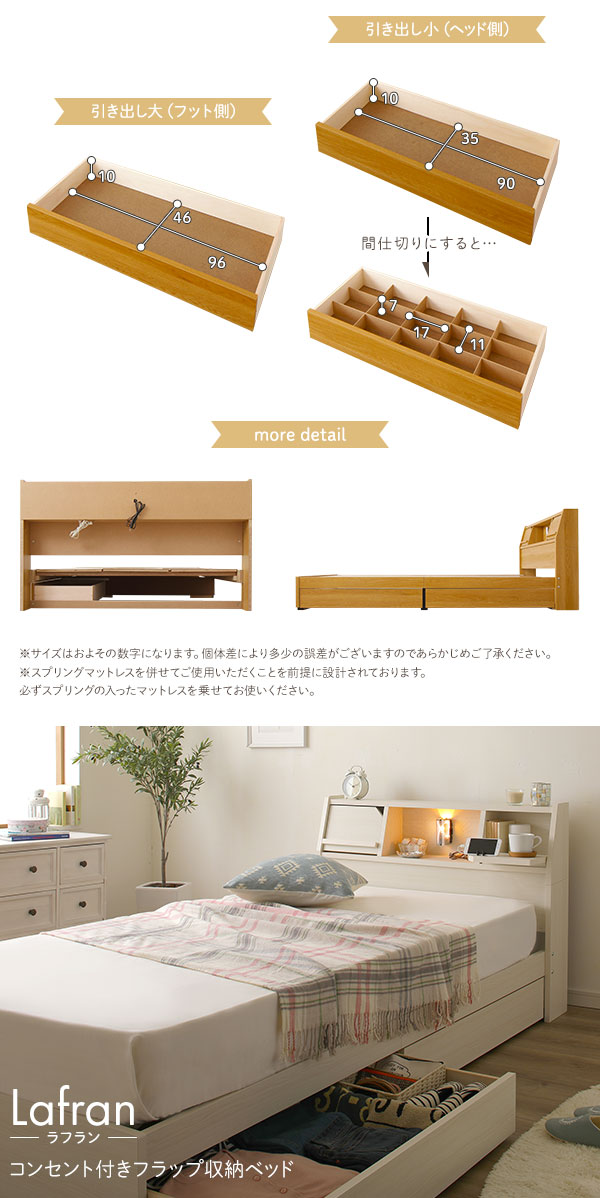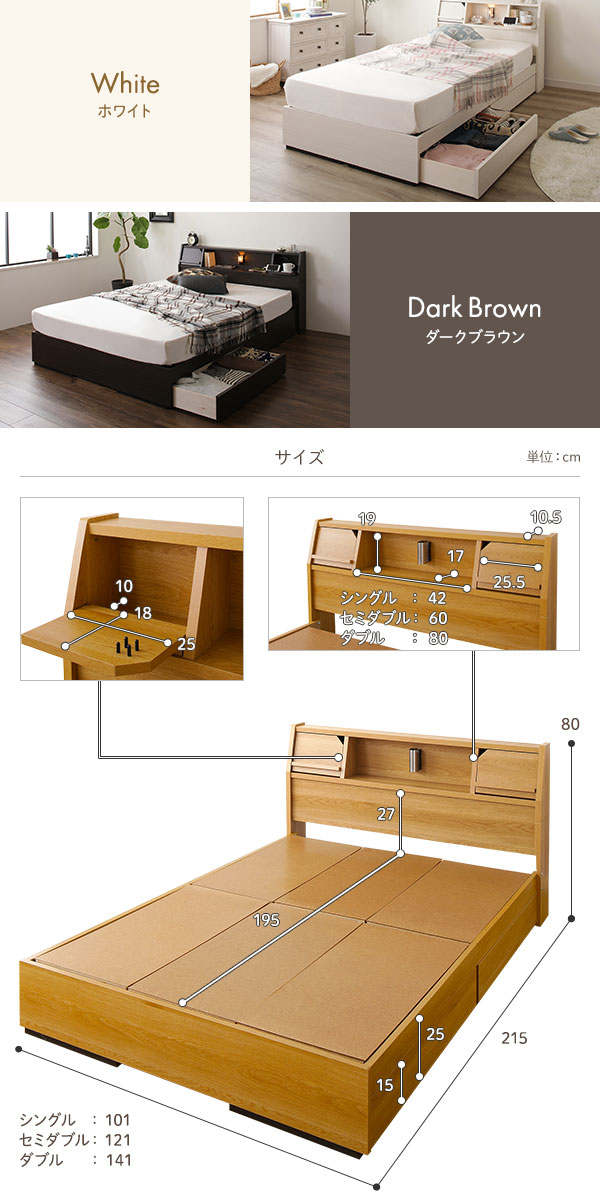 ●大型商品のため、複数購入時は追加送料がかかる場合がございます。 ■サイズ(約) ベッドフレーム/ シングル 幅101cm×長さ215cm×高さ77cm セミダブル 幅121cm×長さ215cm×高さ77cm ダブル 幅141cm×長さ215cm×高さ77cm 引出し内寸 (大)幅96cm×奥行40cm×高さ10cm (小)幅90cm×奥行35cm×高さ10cm ■梱包サイズ・重量(約) ベッドフレーム/ シングル 1.幅104cm×奥行30cm×高さ80cm (18kg) 2.幅205cm×奥行10cm×高さ8cm (9kg) 3.幅101c...