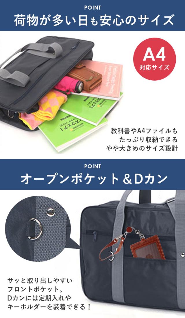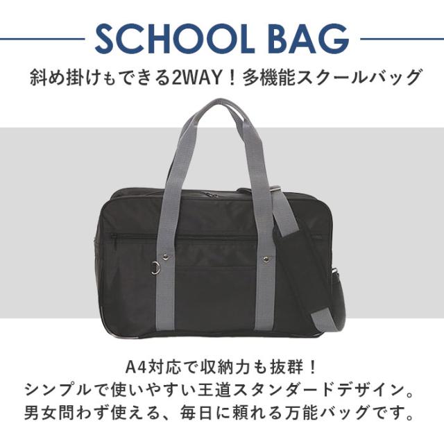 | 商品説明 | トートとしてはもちろん、ショルダーバッグとして斜め掛けも出来る2WAY対応のスクールバッグです。シンプルで使いやすく、A4サイズに対応。通勤通学にぴったりです☆ |