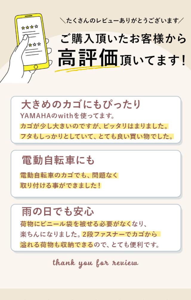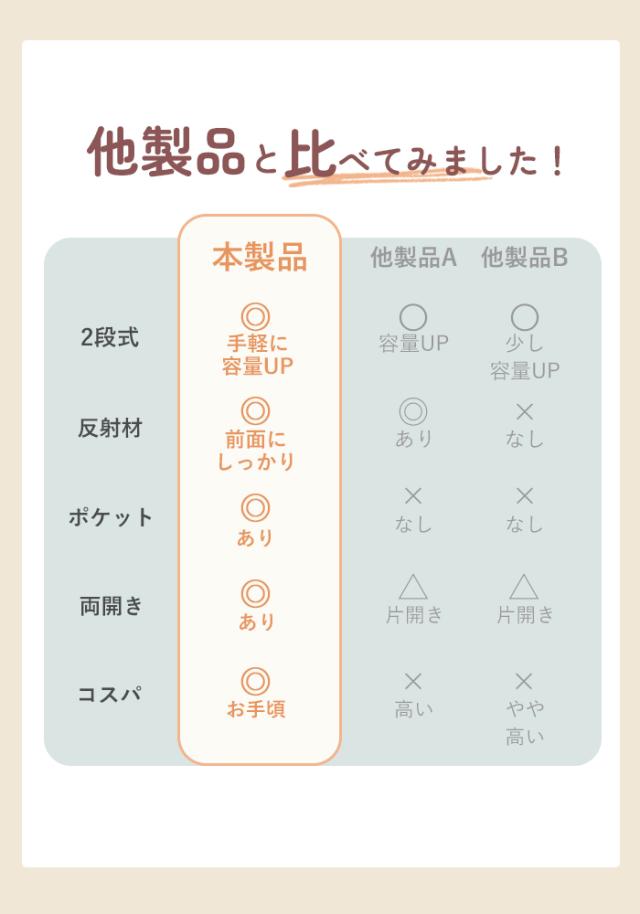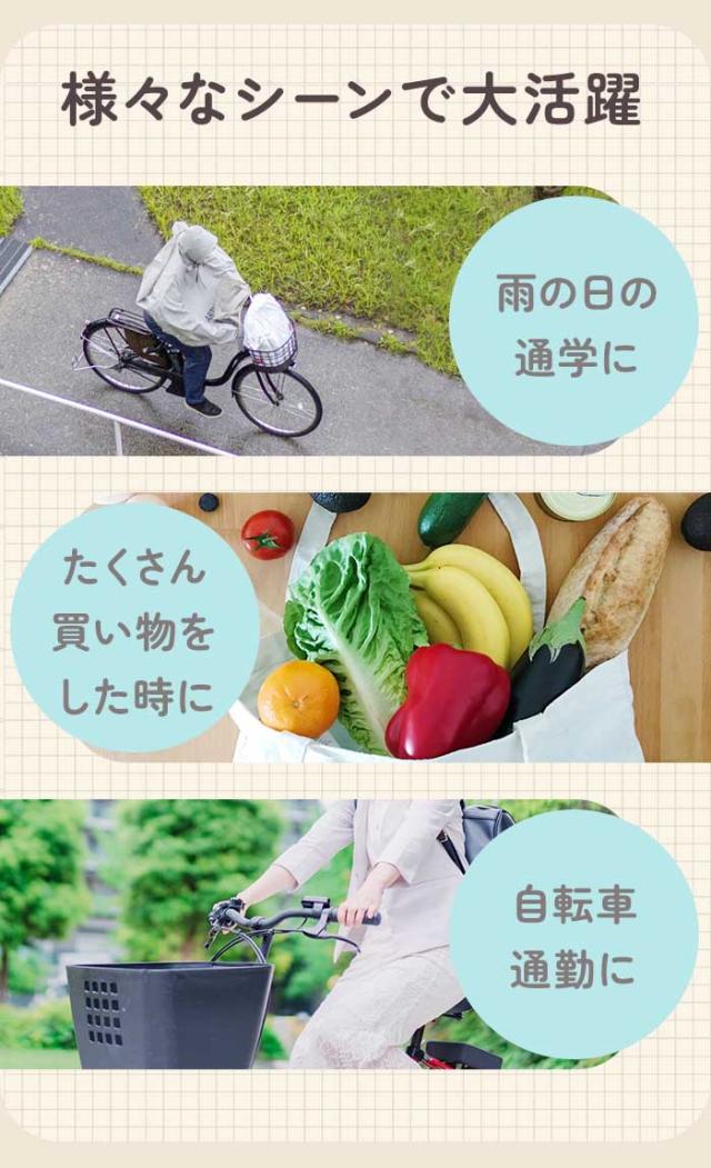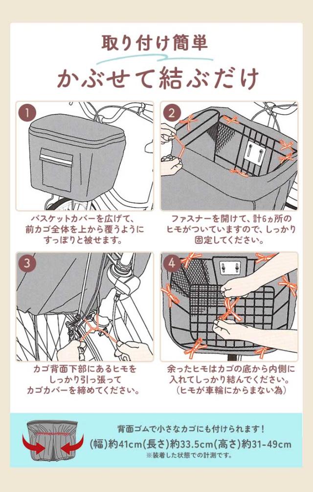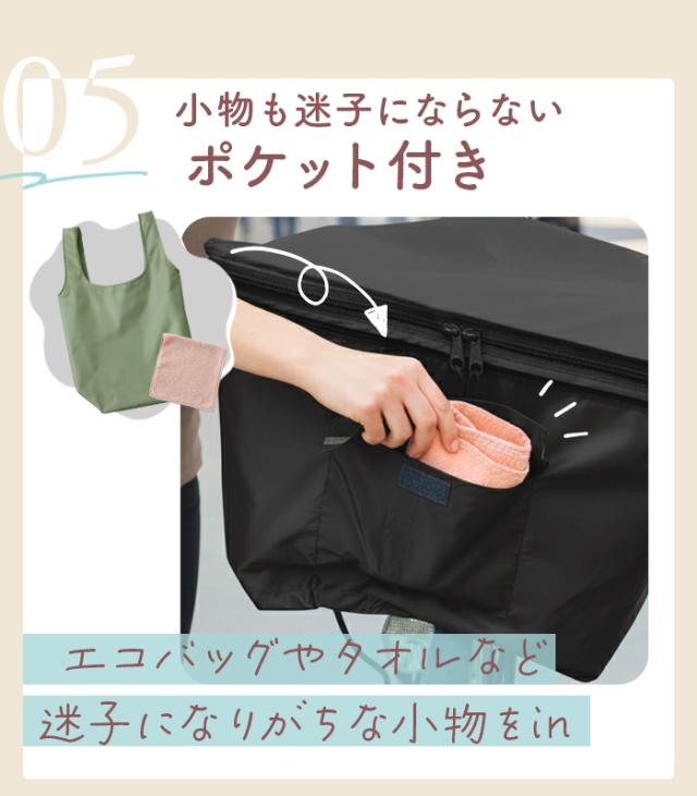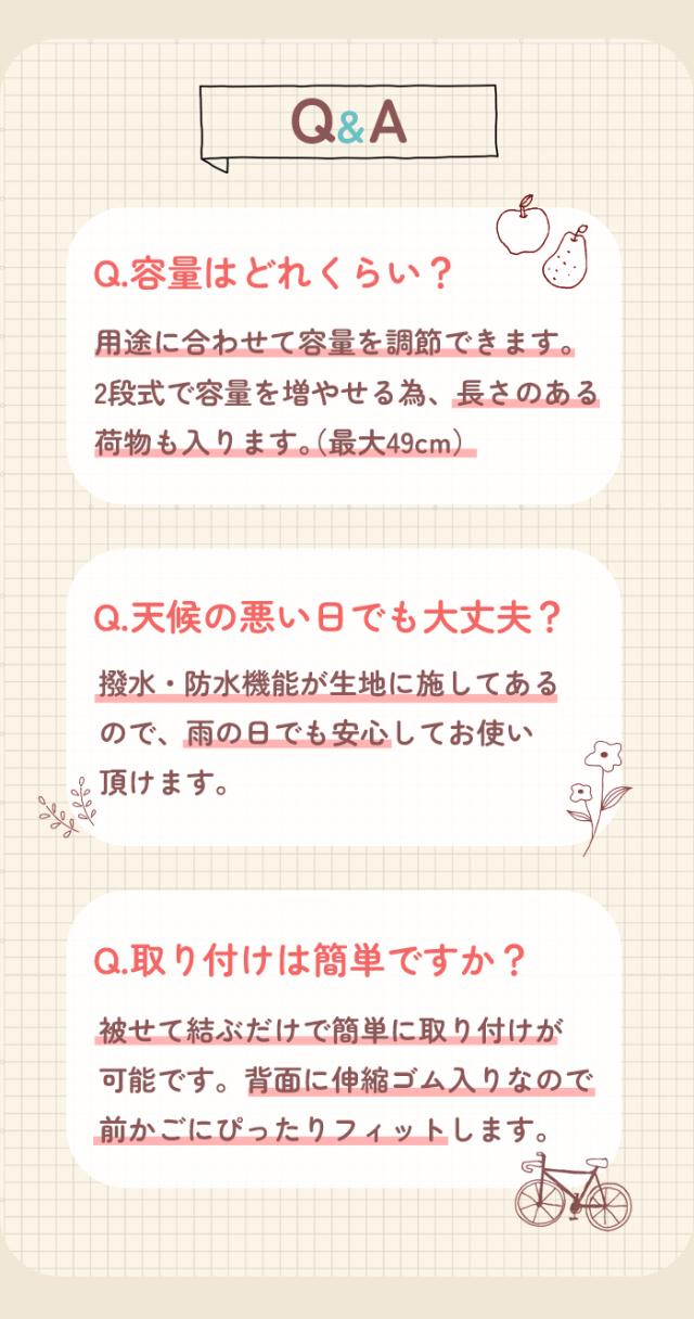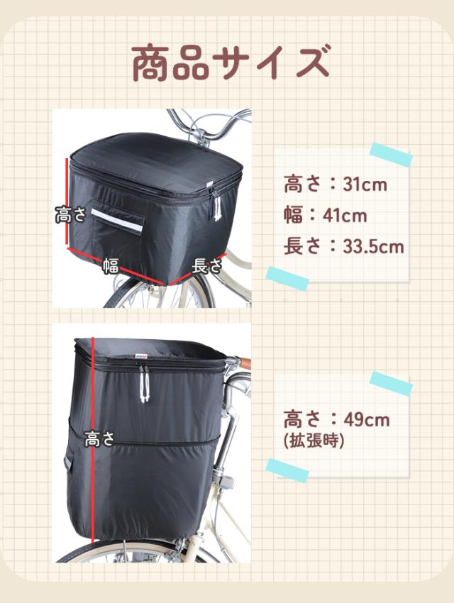 | 商品説明 | 商品説明 荷物が無いときはすっきり収納!荷物が多いときはたっぷり収納できる2段式カゴカバーです!背面には伸縮ゴム付きなので小さいカゴにもフィット!ファスナーは前からも後ろからも開閉するので使いやすいです♪背面には伸縮ゴム付きなので小さいカゴにもフィット!雨でも安心なはっ水加工で大切な荷物を雨やひったくりから守ってくれます! |