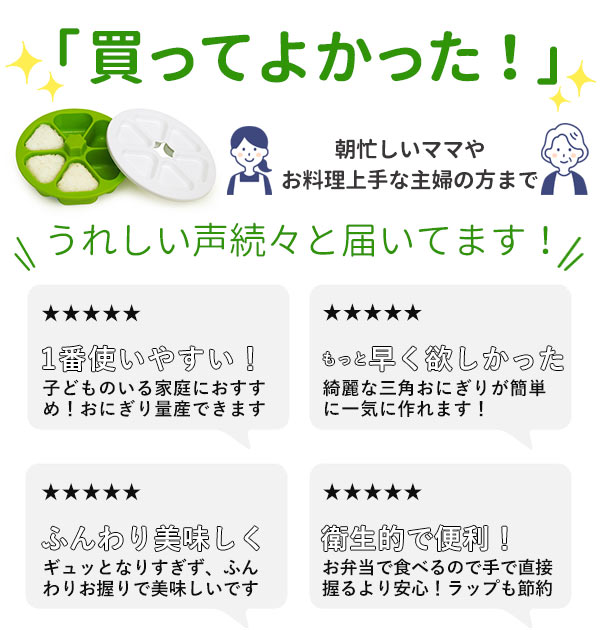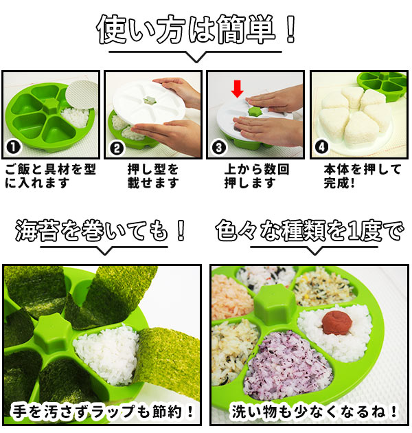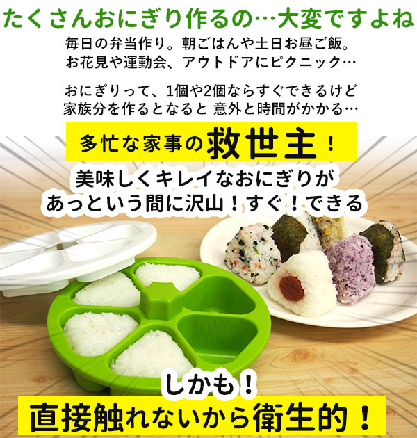 | 商品説明 | 本体にご飯を入れてギュッと押すだけで、 誰でも簡単にきれいな形のおにぎりが、 1度に1〜6個のおにぎりが作れます。 おにぎりに直接触れずに作れるので衛生的です。 本体と押し型にはご飯がつきにくいように溝がついていて、 たくさん作りたい時に大幅時短できます。 具を変えて作ると、6種の味を一気に作ることができます。 海苔をセットして作ると、手を汚さずに海苔巻きおにぎりが作れます。 忙しい朝のお弁当作りや、楽しいお出掛け、パーティーの前に! |