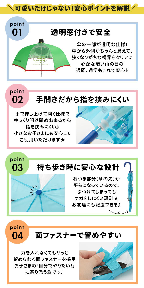 | 商品説明 | サンリオ、ディズニーの大人気キャラクターの可愛いデザインで、雨の日でも気分UP♪手開きタイプなので、手を挟まず小さなお子様でも安全です。傘の一部が透明になっているので、雨の日の視界がさえぎられず、雨の日の通園、通学にも安心です。 |