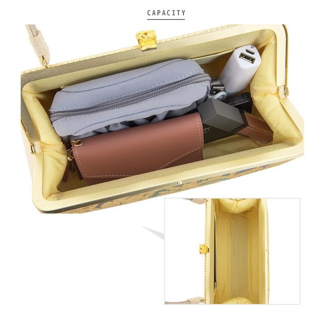 真鍮の持ち手が美しいバッグは、お財布やお化粧ポーチ、携帯電話などが収納できるサイズです。