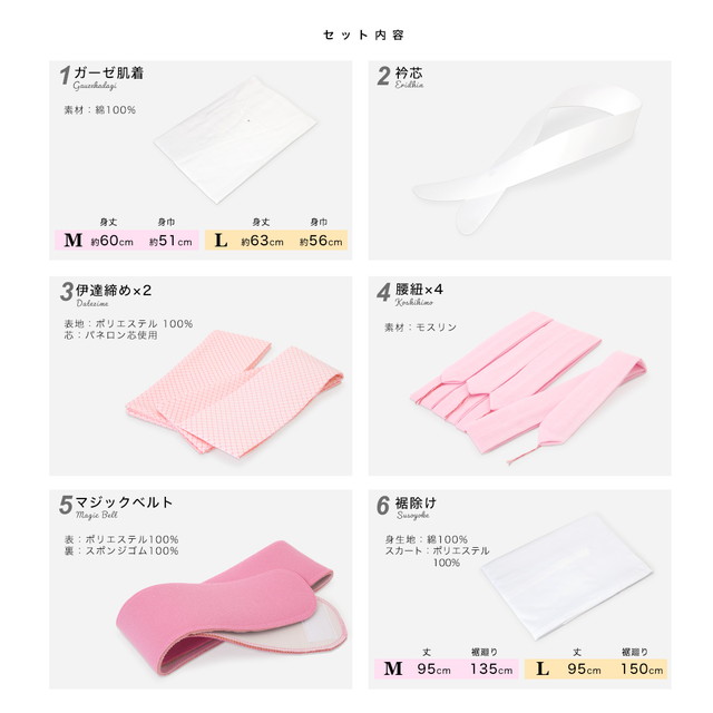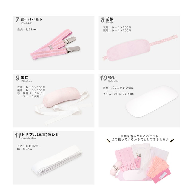 セット内容は【肌着、裾除け、衿芯、腰紐×4、伊達締め×2、マジックベルト、着付けベルト、前板、後板、帯枕、三重仮紐】の11種類15点セットになります。
