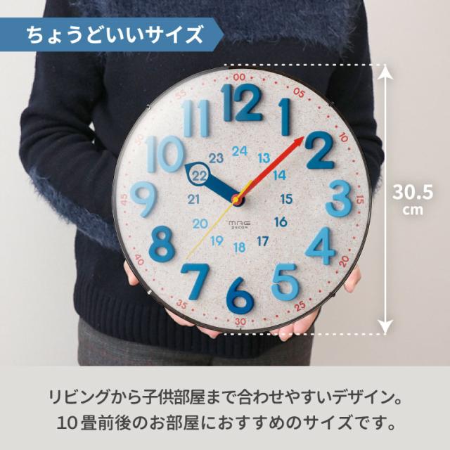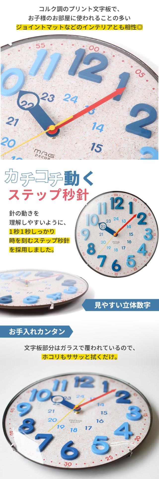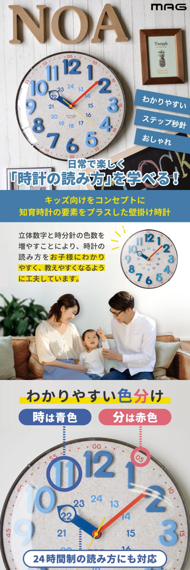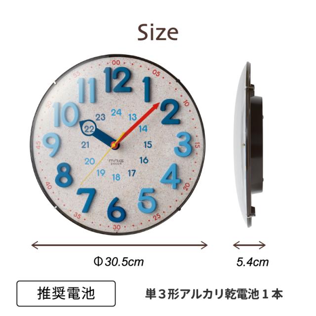 ●キッズ向けをコンセプトに、知育時計の要素を加味したデザイン。立体数字と時分針にこだわり、24時間制の読み方にも対応。