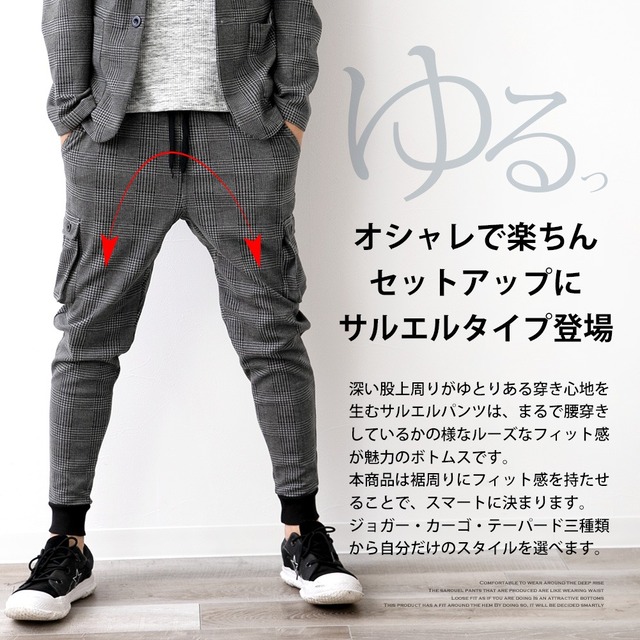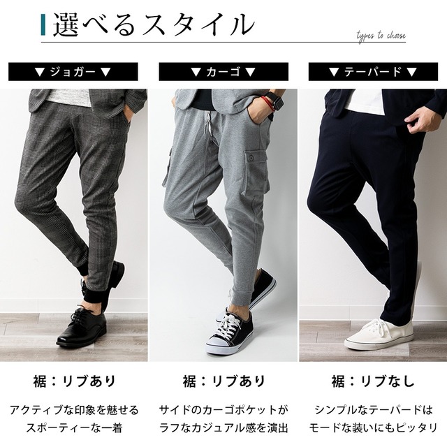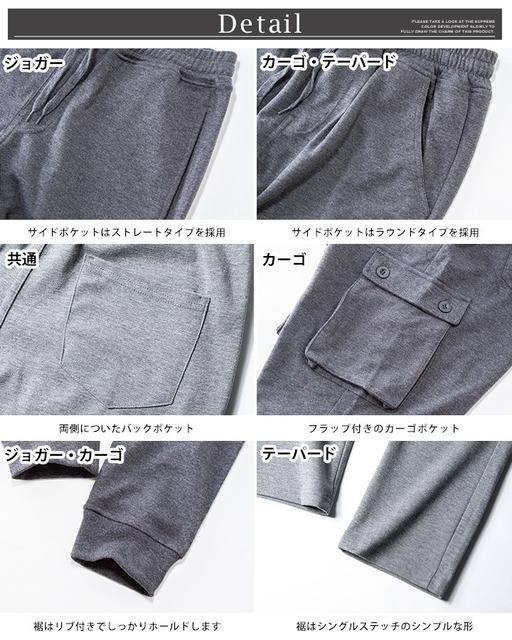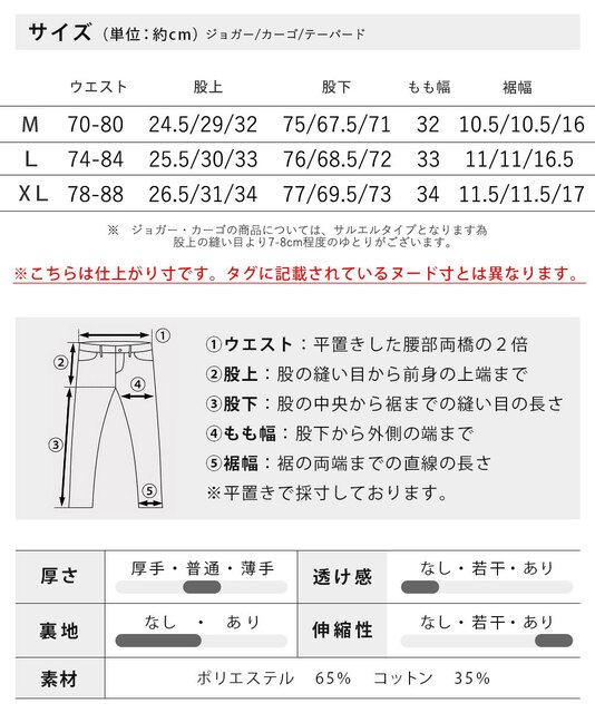 | ジョガー・サイズ | ウエスト | 股上 | 股下 | もも幅 | 裾幅 |