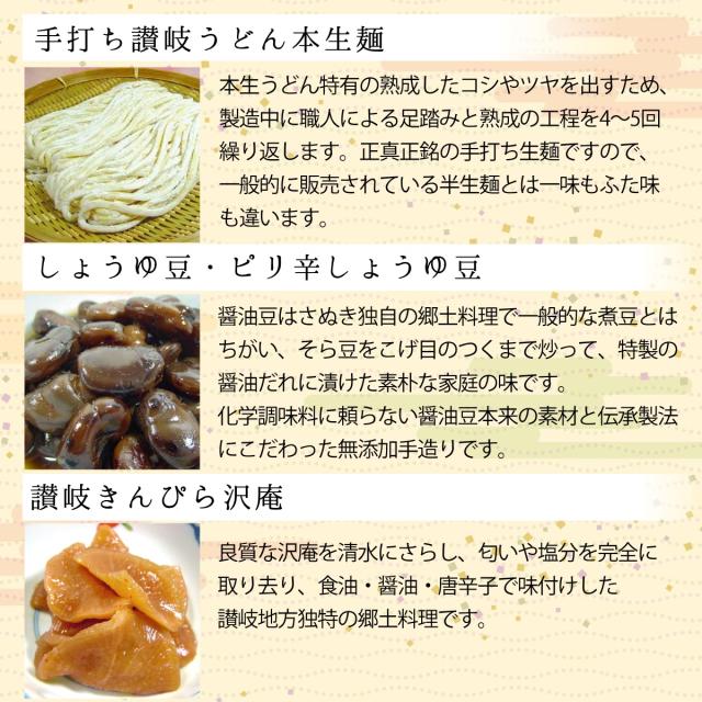 ■セット内容 : 手打ち本生讃岐うどん (つゆ入り) / 無添加しょうゆ豆 / 無添加ピリ辛しょうゆ豆 / 鎌田 讃岐うどん醤油 / 鎌田 ポン酢醤油 / 子持ちきくらげ / 讃岐きんぴら沢庵