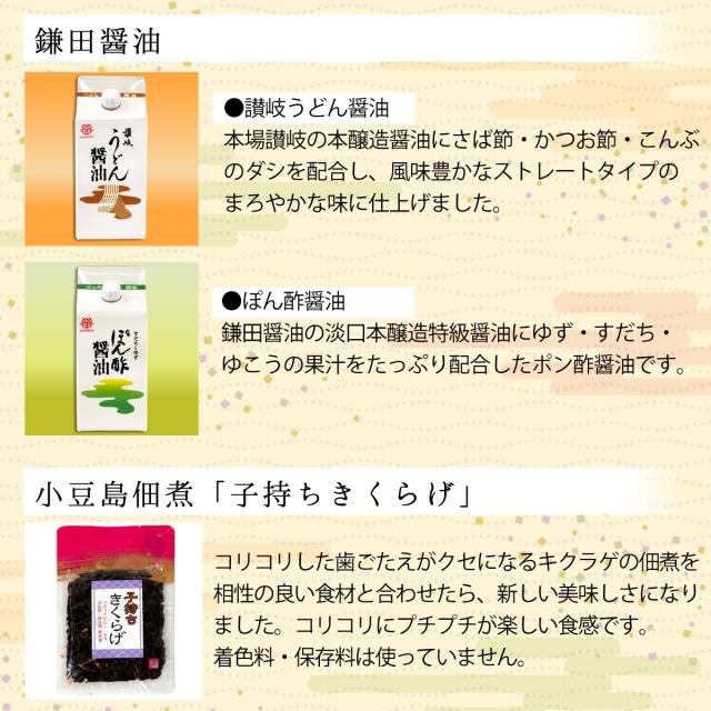 【送料無料】だし醤油で有名な鎌田醤油製品のほかオリジナルの本生讃岐うどん、無添加しょうゆ豆や小豆島佃煮など、讃岐ならではの美味しいものを7品お試しいただけます。 // 母の日 父の日 お中元 ギフト お供え 敬老の日 お歳暮