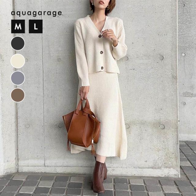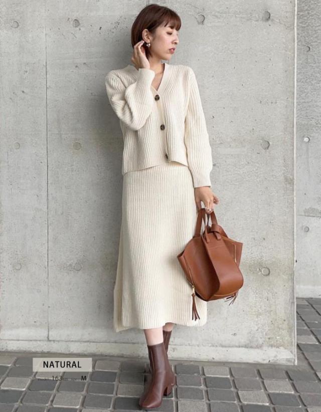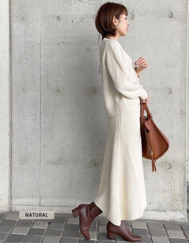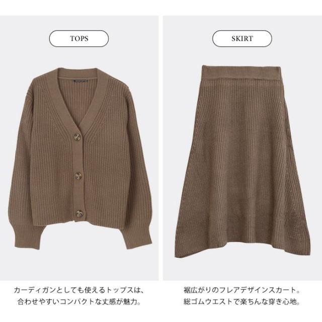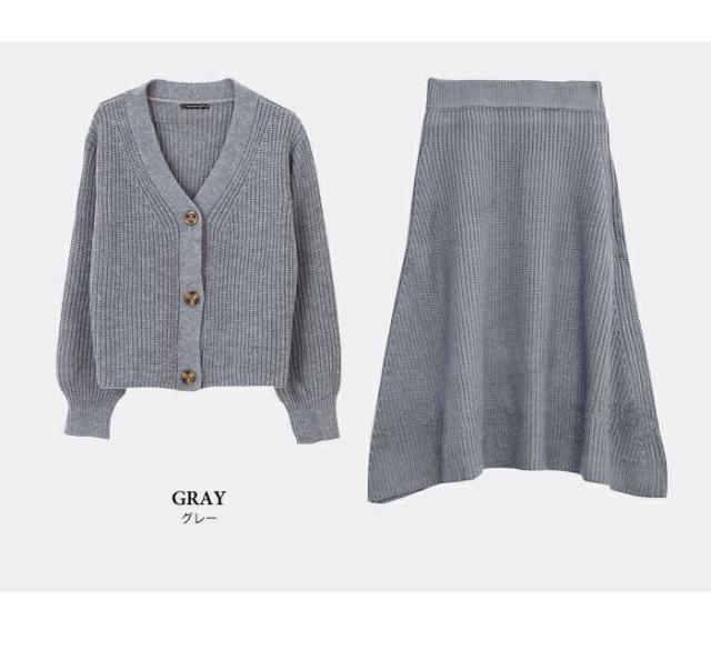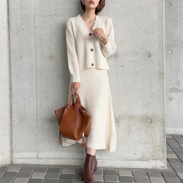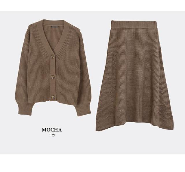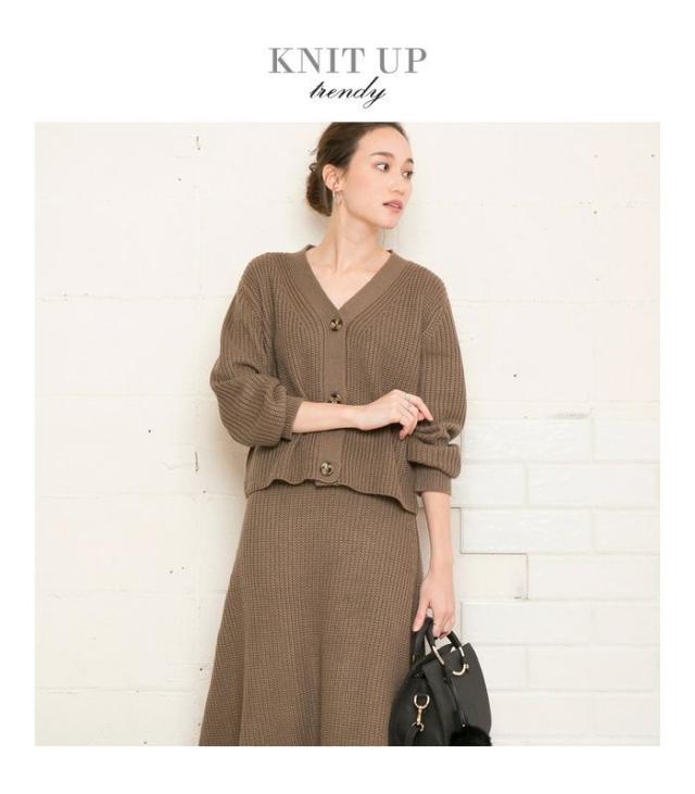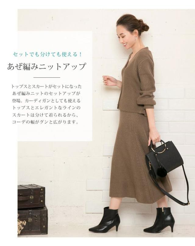 トップスとスカートがセットになったあぜ編みニットのセットアップが登場。