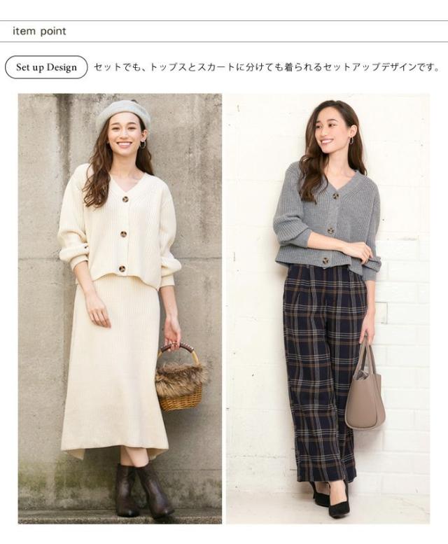 カーディガンとしても使えるトップスとエレガントなラインのスカートは分けて着られるから、