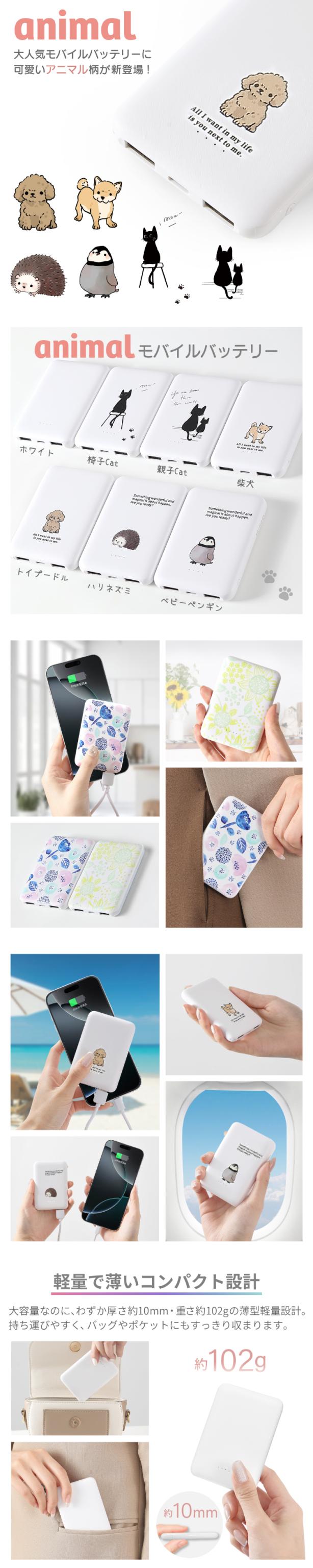 - 可愛いモバイルバッテリーです。 薄くて使いやすいです。 アニマル柄の種類がもっとあると良いと思います。