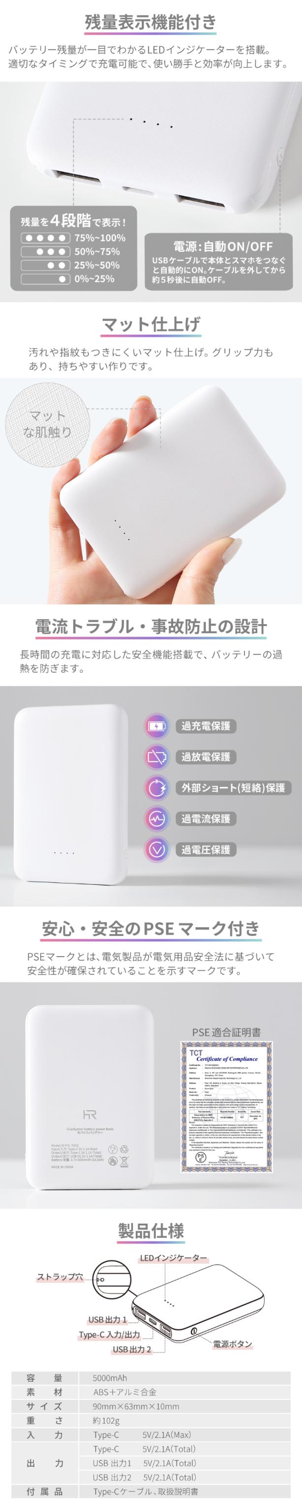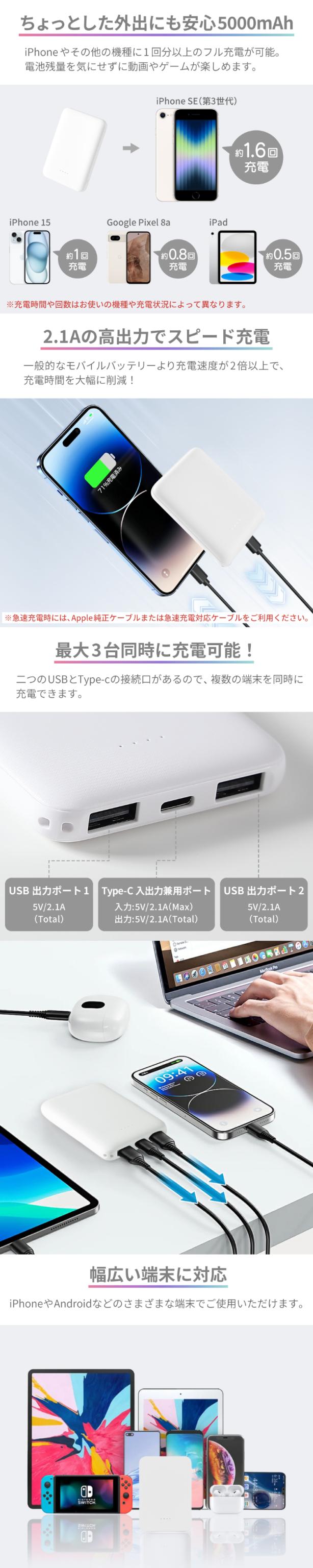 極小超軽量 5000mAh モバイルバッテリー コンパクト 長期保証 PSE認証 PL保険加入 2A 急速充電 2台同時充電 カードサイズ 持ち運び 軽量 iPhone Android Galaxy AQUOS Xperia iPad 大容量 充電器 充電バッテリー アイフォン アンドロイド