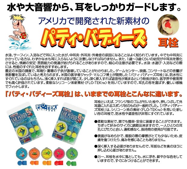 ●アメリカの医学者ジャック・マルコフ博士が開発したFLO-TEKシリコーン採用の「パティ・バディーズ耳栓」。