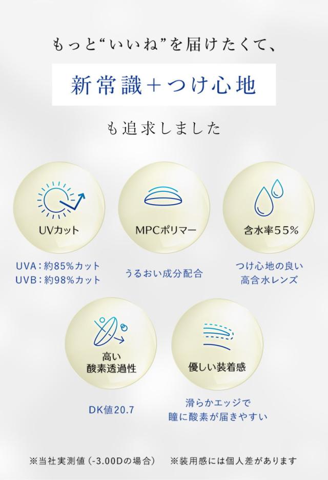 UVカット、MPCポリマー、高含水レンズ(含水率55%)、高い酸素透過性(DK値20.7)、なめらかエッジ