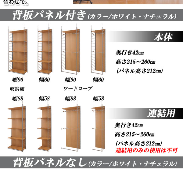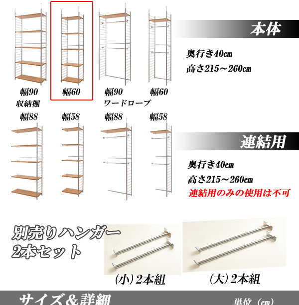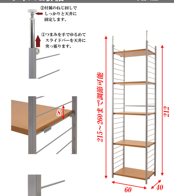 ■商品サイズ/本体:(約)幅60×奥行40×高さ215〜260cm、収納部内寸:(約)幅55×奥行34.5×高さ8cm間隔で25段階