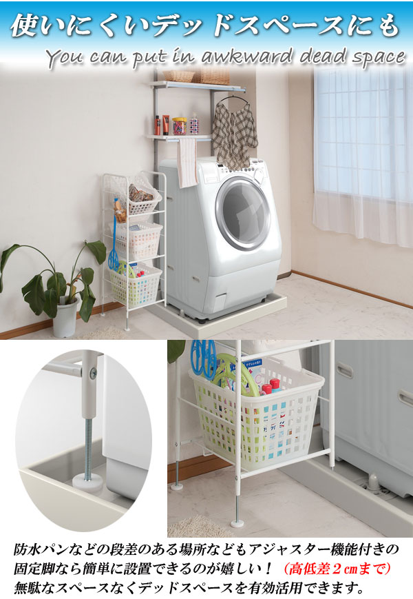 付属でフックが付いているので、袋やかごを掛けることもできとっても便利です!脚はキャスターとアジャスターの2種類入っているので、お部屋の状況に合わせてお好きなほうを選ぶことが出来ます!防水パンをまたいで使用する場合は、アジャスターで高さを調節することができ、臨機応変に対応できます。