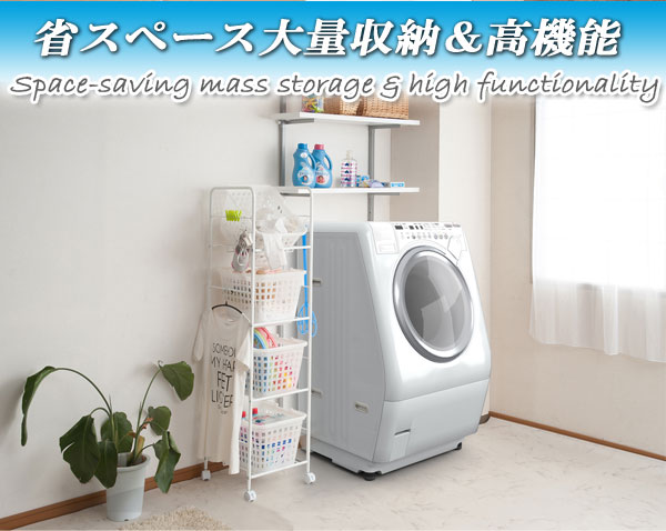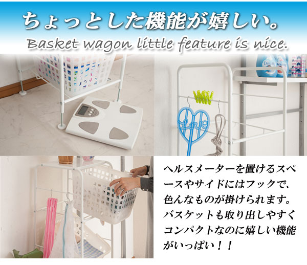 ■商品について/ランドリーで使うのに便利なワゴンが新しくなって新登場!使い易くするために、かごを斜めに設置した状態でも使用できるよう工夫しています。
