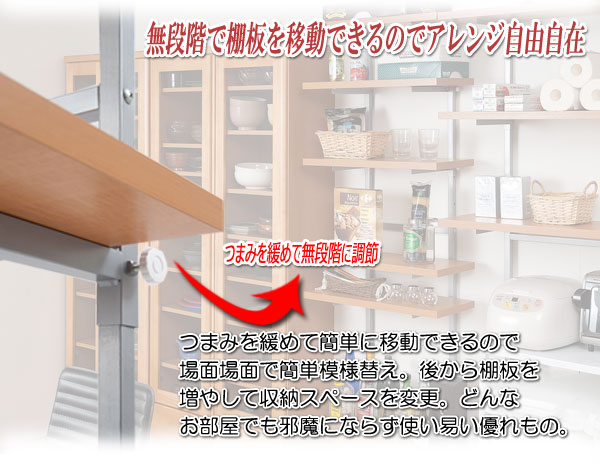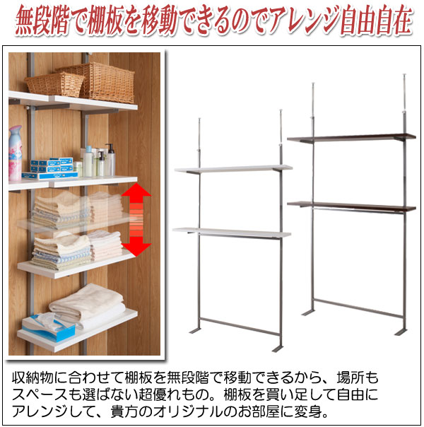 ■商品について/無段階に棚板の位置を調節できる突っ張りウォールシェルフが新たに登場!前回とは違い棚板の位置を無段階に調節できるから自分の丁度いい高さにすることができます!キッチンで食器や保存食を、リビングで雑誌やDVDを、ランドリーではバスタオルのストックや洗剤を置いたり。