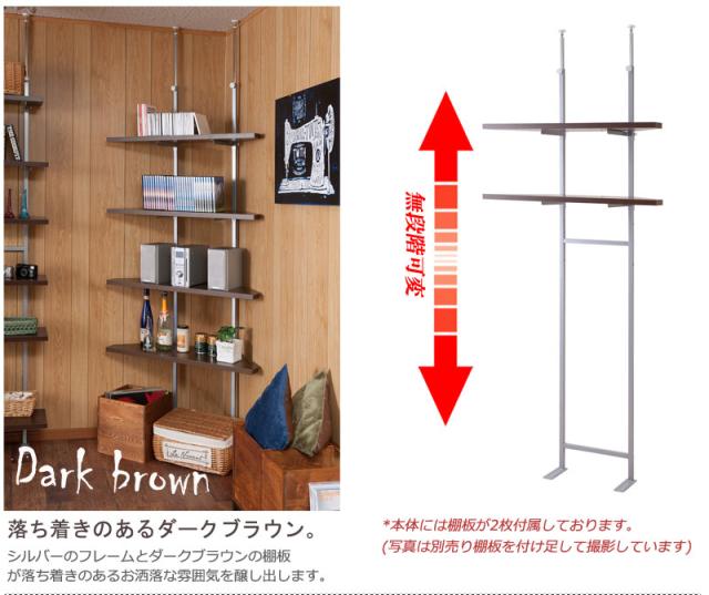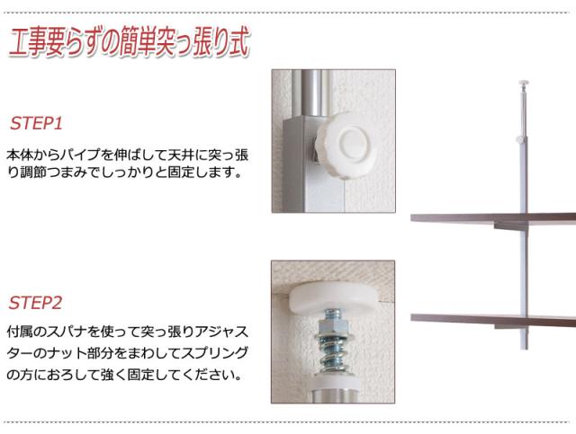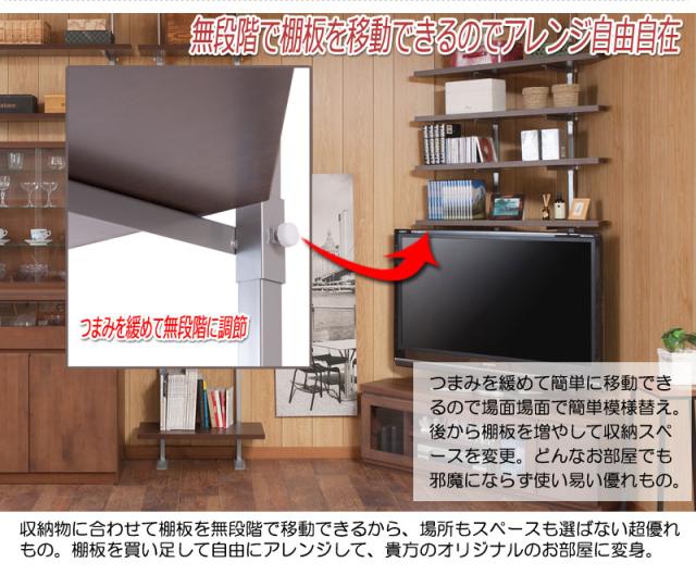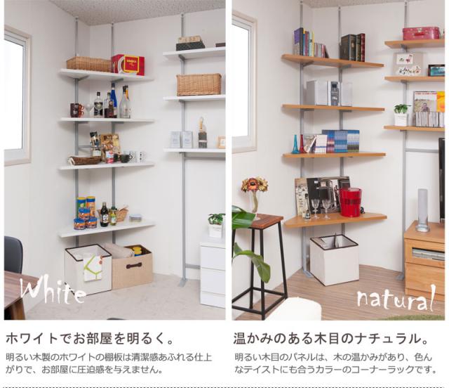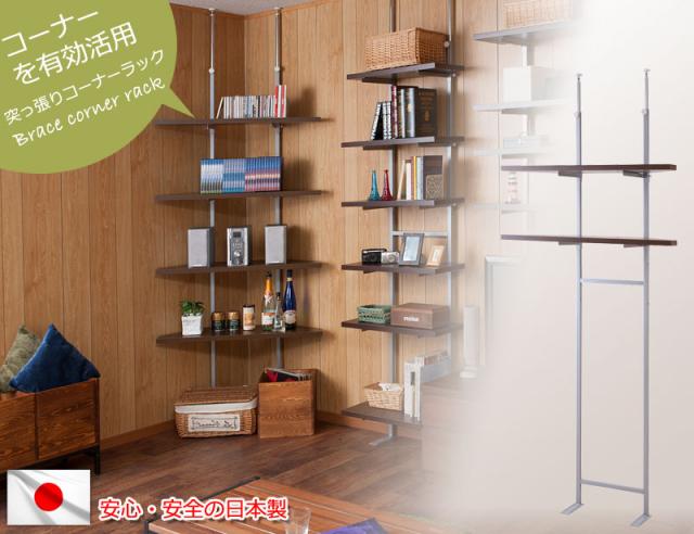 ■商品について/無段階に棚板の位置を調節できる突っ張りウォールシェルフにコーナーラックが登場!棚板の位置を無段階に調節でき、自分の丁度いい高さに設定することができます。