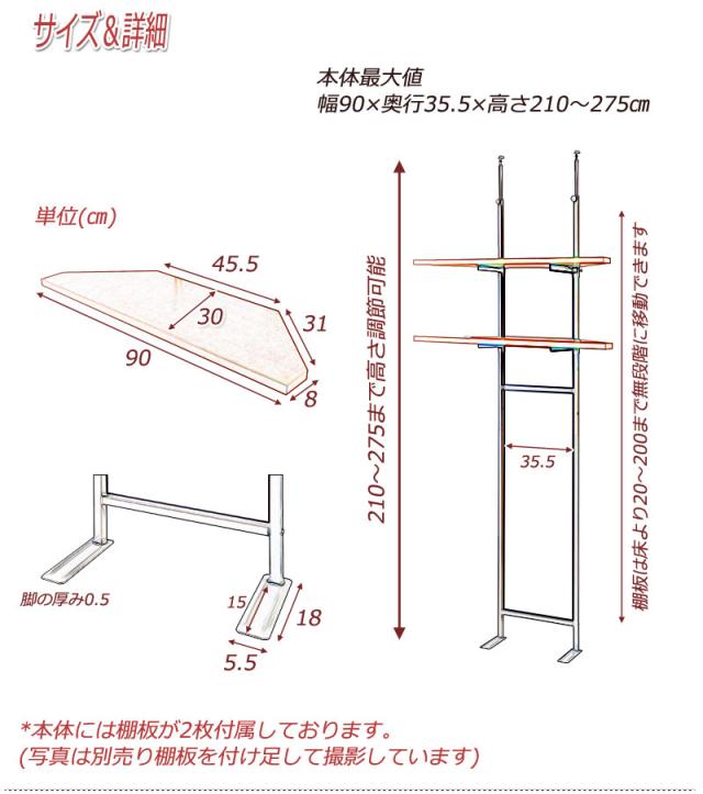■商品サイズ/本体:(約)幅90×奥行35.5×高さ210〜275cm、棚板:(約)幅90×奥行30cm
