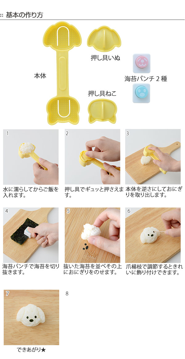 | 材質 | おにぎり型(本体・押し具いぬ・押し具ねこ):ポリプロピレン 海苔パンチ:ABS樹脂、亜鉛合金 |