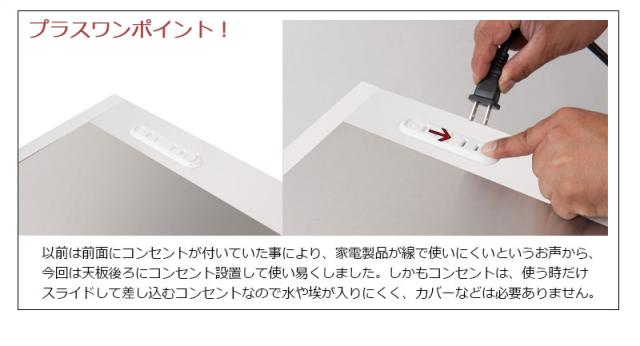 インテリア性を重視したデザイン、収納しやすさを追求した引出、家電製品の配線を考慮したコンセント、間仕切りとしても使えるスッキリとした背面。