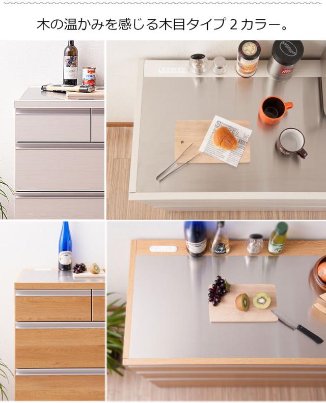 ■商品の仕様/前板:強化プリント紙化粧繊維板、天板:ステンレス貼り、その他:プリント紙化粧