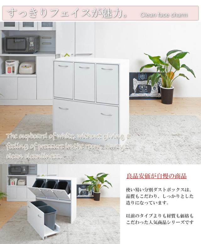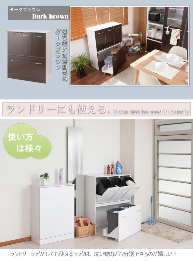 上段はフラップ式の14リットルのゴミ箱が付いた3分別、下段はワゴンタイプの24リットルの大型ゴミ箱が2個付いて、使い易く、しかもゴミ箱に見えないのがお洒落!裏面もシート貼りをしているので、間仕切りとしてもご使用になれます。