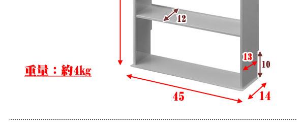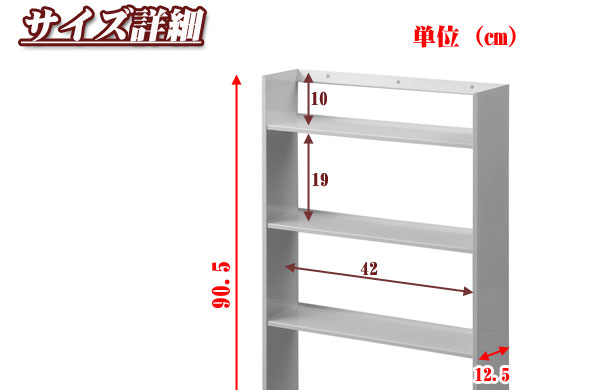 ■商品サイズ/本体:(約)幅45×奥行14×高さ90.5cm、収納部内寸:(約)幅42×奥行12×高さ(最上部)10(その他)19cm、巾木よけ:(約)幅1×高さ10cm、材質/本体:スチール(エポキシ樹脂粉体塗装)