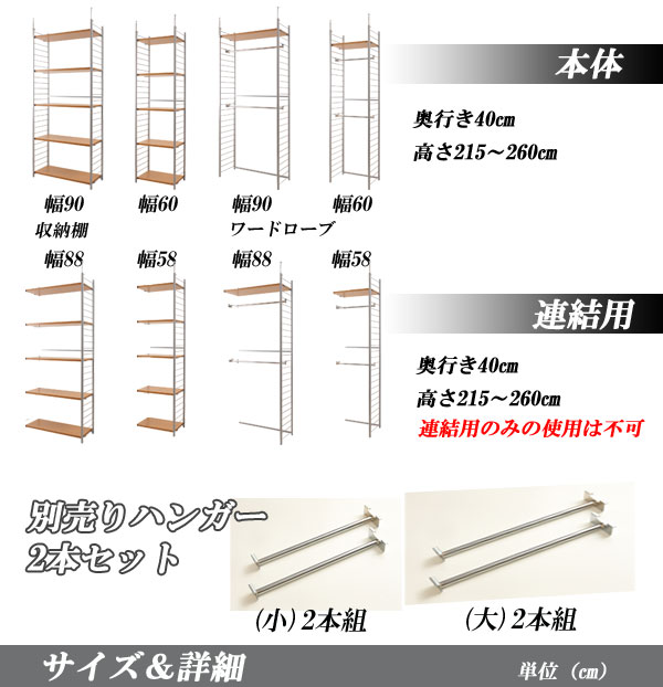 棚板:プリント紙化粧繊維板、ハンガーバー:スチール(メッキ仕上げ)、耐荷重/棚板:約5kg、ハンガーバー:約5kg、商品重量:約28kg、組立品(所要時間約45分)日本製