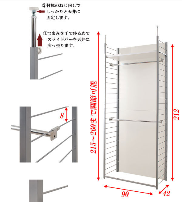 ■商品サイズ/本体:(約)幅90×奥行42×高さ215〜260cm、収納部内寸:(約)幅85×奥行34.5×高さ【上下約均等に設置した場合】(上)93(下)90cm、ラダー間隔:(約)8cm