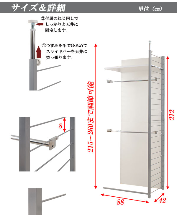 ■商品サイズ/本体:(約)幅58×奥行42×高さ215〜260cm、収納部内寸:(約)幅55×奥行34.5×高さ【上下約均等に設置した場合】(上)93(下)90cm、ラダー間隔:(約)8cm