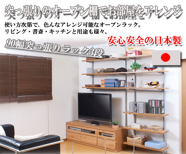 日本製 突っ張り ウォールシェルフ 3段 幅90 ダークブラウン 大容量 つっぱり ラック 壁面 突っ張り棚 伸縮 省スペース 木製 キッチン 北欧(代引不可)【送料無料】