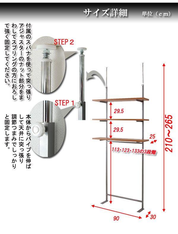 ■商品サイズ/本体:(約)幅90×奥行30×高さ210〜265cm、棚板サイズ:(約)幅90×奥行25cm、棚〜棚高さ:(約)29.5cm