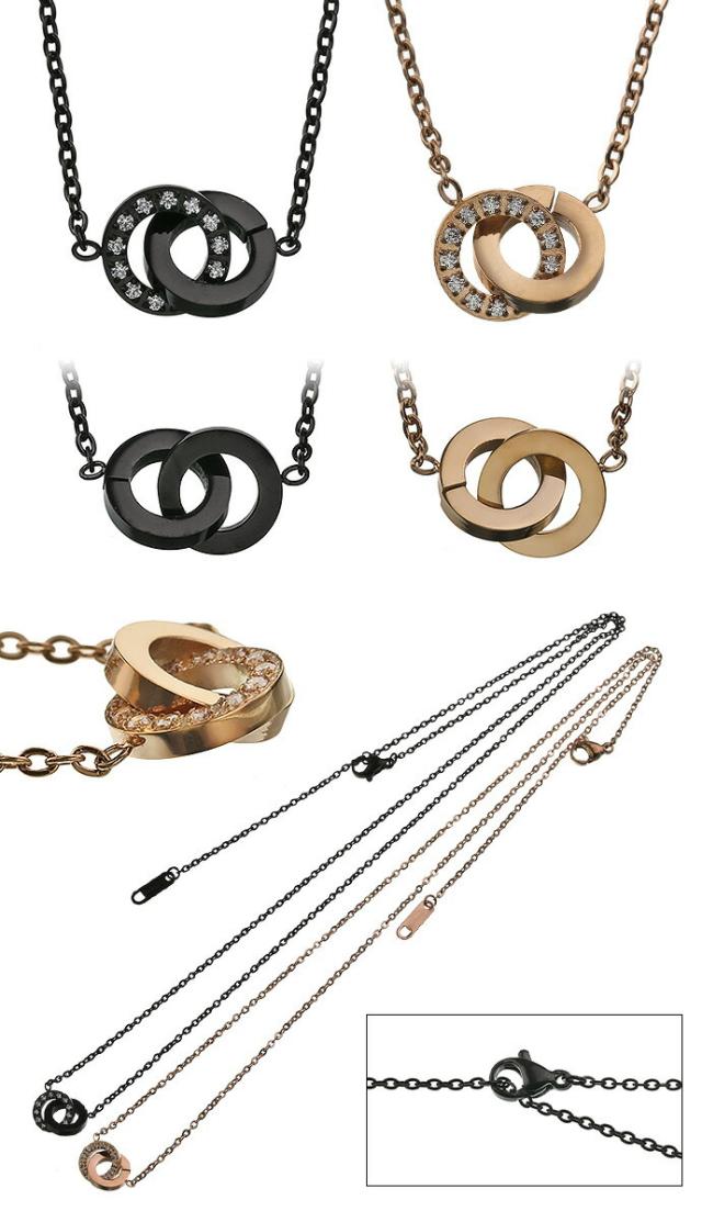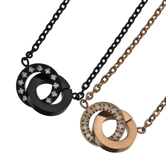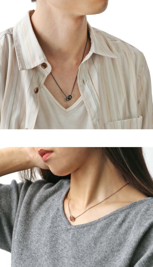 2つのリングが交わった、ダブルリングデザインのペアペンダントです。リングの1つにはジルコニアが埋め込まれており、胸元でさり気なく輝きます。繋がったリング2つがインフィニティ(無限)を表す「∞」マークに見えるので、永遠の愛を誓いたい大切な方への贈り物に最適です。