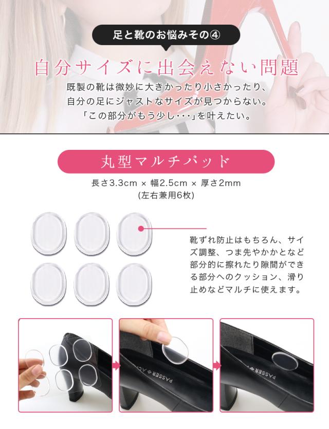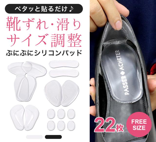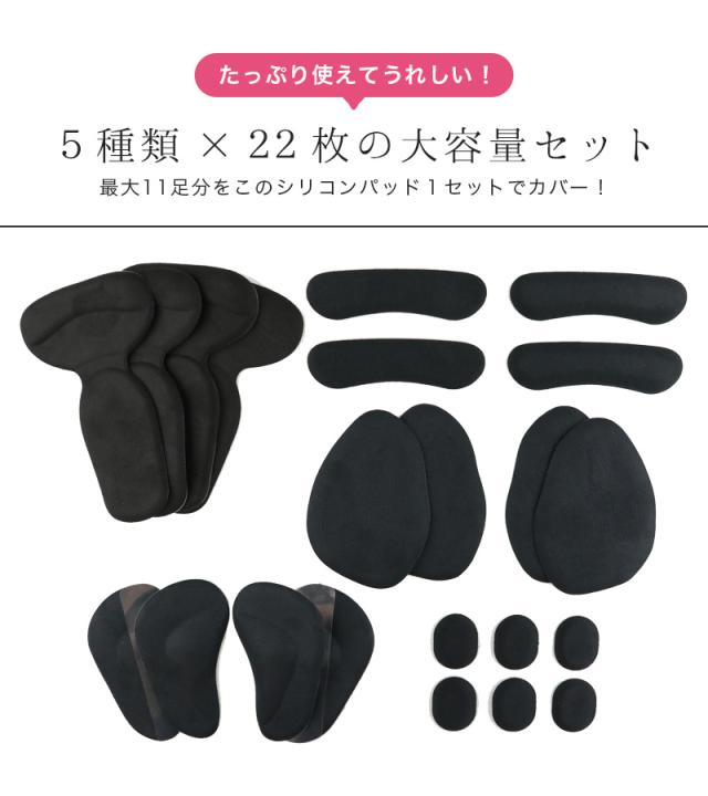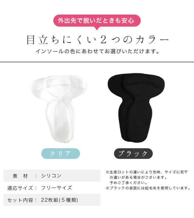 | 商品詳細 | ・素材:シリコン ・適応サイズ:フリーサイズ ・セット内容:22枚組(5種類) ・カラー:クリア(透明)/ブラック 【パカパカ防止 T字型パッド(左右兼用4枚)】 長さ14cm×幅8.6cm×厚さ4mm 【靴擦れ防止 かかとパッド(左右兼用4枚)】 長さ10cm×幅2.6cm×厚さ1.5mm 【つま先 衝撃吸収パッド(左右各2枚)】 長さ9.8cm×幅7.0cm×厚さ1.5mm 【土踏まず アーチパッド(左右各2枚)】 長さ9.6cm×幅5.7cm×厚さ6mm 【丸型 マルチパッド(左右兼用6枚)】 長さ3.3cm×幅2.5cm×厚さ2mm |