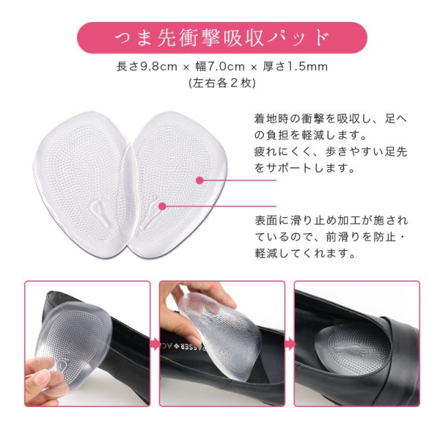 - 2足分あるので良かった。ヒールを履くのに大きくて歩きづらくてシリコンパットを敷いたら歩きやすくて助かった。