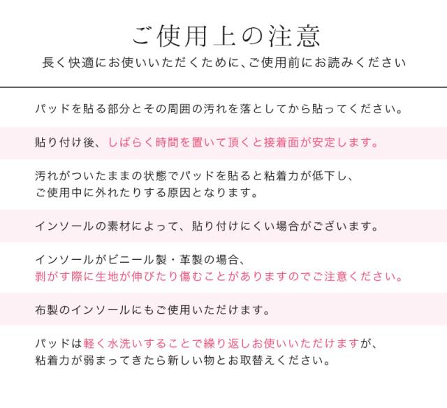 | 注意事項 | 【長く快適にお使いいただくために、ご使用前にお読みください】 ※パッドを貼る部分とその周囲の汚れを落としてから貼ってください。 ※貼り付け後、しばらく時間を置いていただくと接着面が低下し、ご使用中に外れた原因となります。 ※汚れがついたままの状態でパッドを貼ると粘着力が低下し、ご使用中に外れたりする原因となります。 ※インソールの素材によっては、貼り付けにくい場合がございます。 ※インソールがビニール製・革製の場合、剥がす際に生地が伸びたり傷むことがありますのでご注意ください。 ※布製のインソールにもご使用いただけます。 ※パッドは軽く水洗いすることで繰り返しお使いいただけますが、粘着力が弱まってきたら新しい物とお取替えください。 |