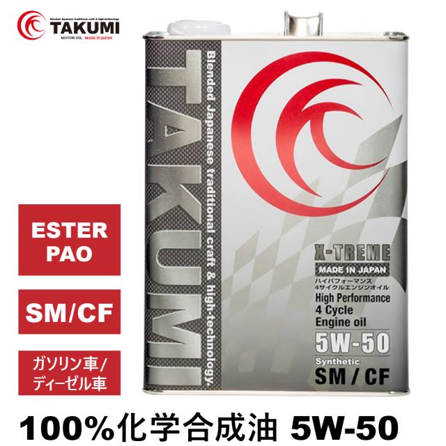 エンジンオイル 5W-50 4L ガソリンディーゼル 化学合成油 エンジンオイル 4輪 PAO エステル レーシングサーキット TAKUMIモーターオイル 送料無料 X-TREME5W-50