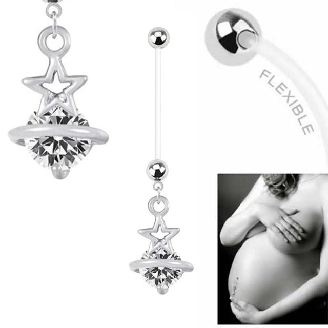 星とクリスタルをセットした土星をモチーフにしたチャームが揺れるマタニティへそピアス。シャフト部分が長いテフロン素材で出来ているので妊娠の時に皮膚が伸びても大丈夫。また、テフロンは抗菌性も高く安心のヘソピアスです。妊娠中の人でも、ピアスホールにトラブルがある人のホールを安定させるピアスとしても使えます。妊娠のお祝いプレゼントにも使えます。出産後もそれぞれのパーツを個別に使えるので、他のボディーピアスと組み替えて使えるのも嬉しい。サーキュラーやバーベルに組み替えてヘリックスやイヤーロブに!