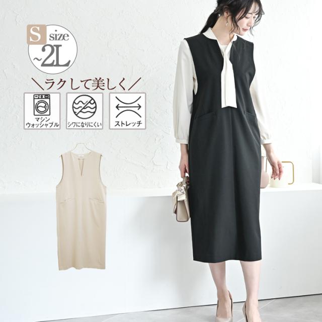 ワンピース ジャンパースカート ロング きれいめ ロングワンピース 黒ワンピース 春 秋 vネック ロング ノースリーブ 低身長 フォーマル セレモニー オケージョン 卒業式 卒園式 入学式 黒 小さいサイズ 大きいサイズ 40代 50代 大人可愛い シワになりにくいワンピース