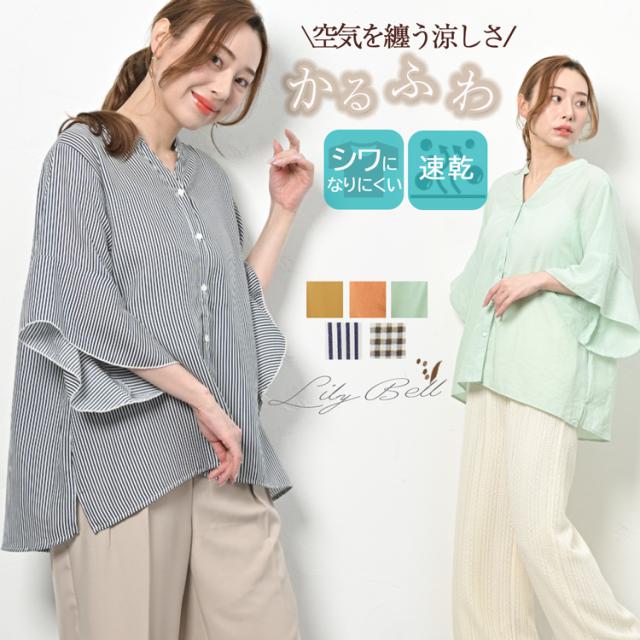 シワになりにくい 半袖 ブラウス シャツ レディース 七分袖 チュニック プルオーバー トップス バンドカラーシャツ 半袖ブラウス チュニックブラウス ゆったり 前ボタン バンドカラー フレア袖 袖フリル ボリューム袖 7分袖 キーネック