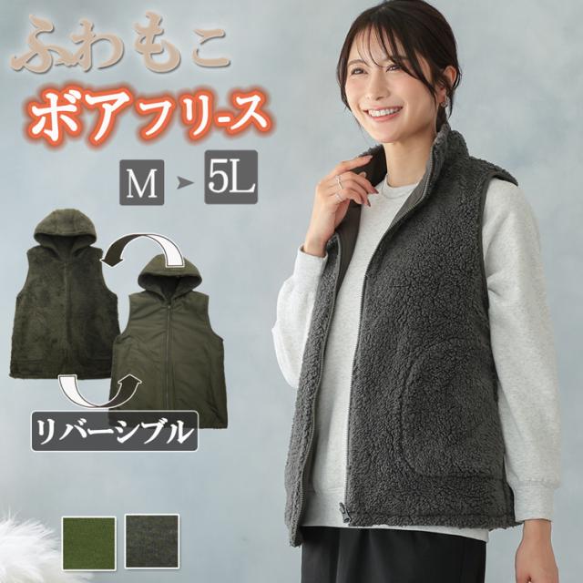 ボアベスト フリース レディース フリースベスト ボア ベスト 中綿ベスト 秋 冬 ボアフリース 裏ボア アウター 厚手 フード付き 前開き 中綿 パーカー あったか 防寒 リバーシブル 無地 グレー カーキ M/L/LL/3L/4L/5L 大きいサイズ あったかベスト 中綿アウター 中綿入り
