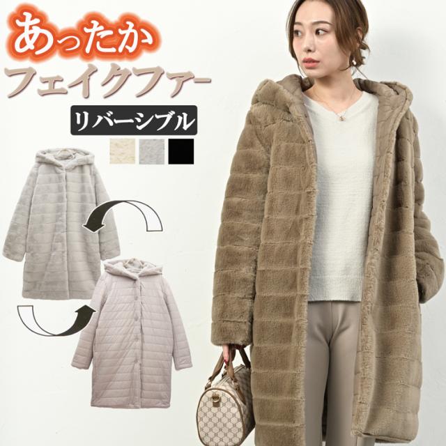 エコファー ファーコート ファージャケット レディース キルティングコート リバーシブル エコファーコート フェイクファー キルティング ジャケット コート アウター 秋 冬 ロング フード パーカー ファー ふわふわ 黒 白 グレー モカ M L フード付き ロングコート 秋冬