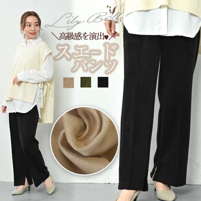 ストレートパンツ ワイドパンツ レディース ロングパンツ スリットパンツ 秋 冬 ストレート ロング パンツ ボトム ワイド セミワイド ウエストゴム スリット ポケット 美脚 ストレッチ ズボン スエード 黒 ベージュ カーキ M L LL 大きいサイズ 服 ポケット付き きれいめ 通勤