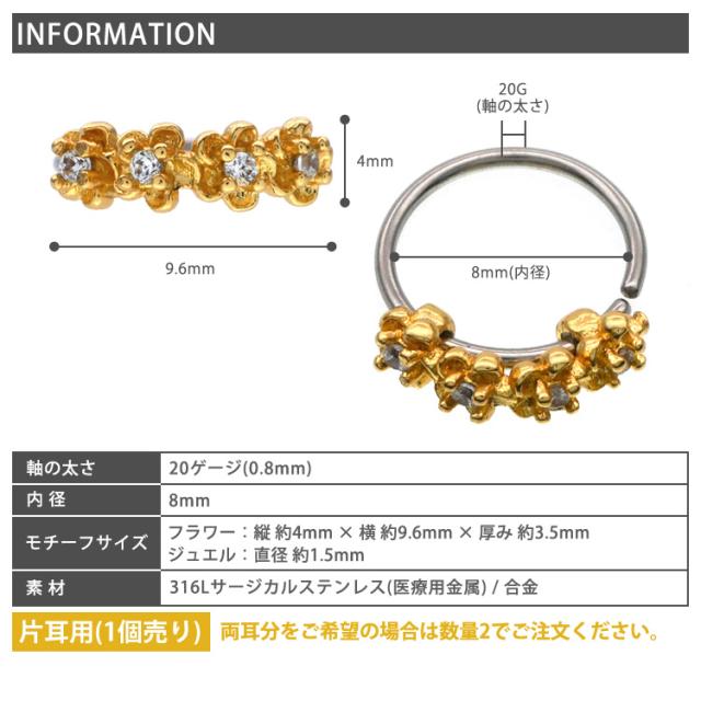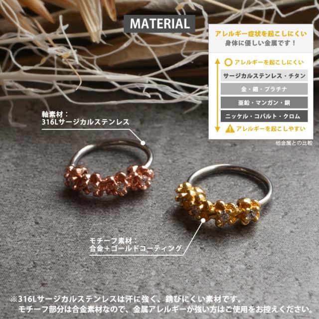 取り付けがカンタンでボールのないリングがプチフラワーモチーフが仲間入りしました。リング部分をひねって取り付ける、ユニークなスタイルが特徴のアニーリングシリーズ。ピアスとしてホールに通しても、挟みこむようにしてイヤーカフとしてもご使用いただけます。可愛さと上品のあるデザインだからこそコーディネートに取り入れやすいシンプルなプチサイズだからこそどんなコーデも合わせやすい♪真ん中の小粒ジュエルでさらに可愛さUP!デートやショッピングにも◎ヘリックスなどの耳の軟骨部分に着ければ一層キュート。もちろん重ねづけもオススメです。ホールに触れるリングは安心のサージカル(医療用)ステンレス素材です。 ※リングを開く際には、前後にねじるように開きます。左右に開くと閉じにくくなり、変形する恐れがありますのでご注意ください。